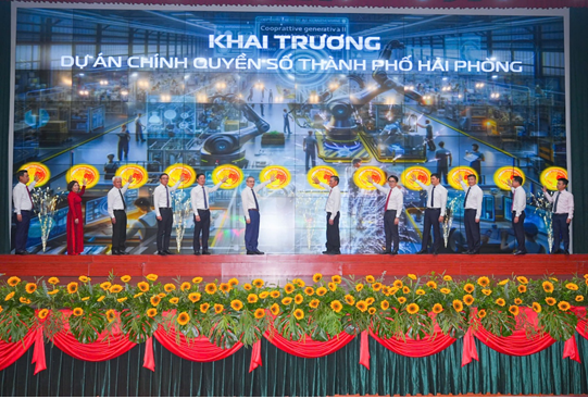 Các đại biểu bấm nút khai trương Dư án Chính quyền số thành phố Hải Phòng
