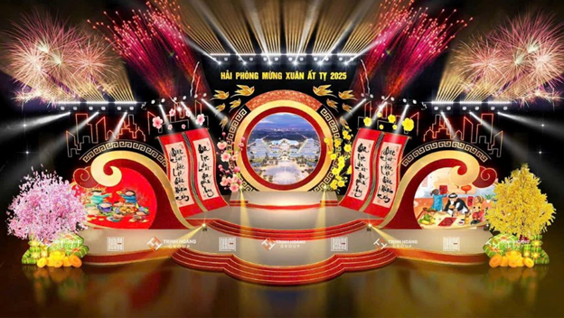 Phối cảnh sân khấu lung linh, mang đậm nét Tết cổ truyền dân tộc tại Đêm nghệ thuật “Hải Phòng- Mùa xuân khát vọng – Chào Xuân mới Ất Tỵ 2025”