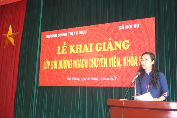Sáng ngày 26/10/2019, Trường Chính trị Tô Hiệu phối hợp với Sở Nội vụ tổ chức Lễ khai giảng lớp Bồi dưỡng ngạch chuyên viên, khóa 56a. Dự Lễ khai giảng có các đồng chí Nguyễn Thị Hải Hà – Phó Hiệu trưởng Trường; Nguyễn Thị Thủy - Phó Trưởng phòng Công chức - Viên chức, Sở Nội vụ thành phố; đại diện lãnh đạo các khoa, phòng nhà trường và học viên của lớp học.