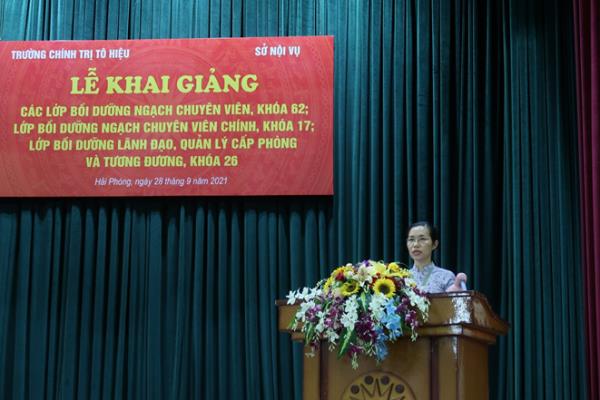 Phát biểu tại Lễ khai giảng, thay mặt Lãnh đạo Trường Chính trị Tô Hiệu đồng chí Nguyễn Thị Hải Hà chúc mừng học viên tham gia các lớp học. Đồng chí nhấn mạnh tính cấp thiết và tầm quan trọng của việc không ngừng bồi dưỡng, nâng cao năng lực chuyên môn và đạo đức công vụ của đội ngũ cán bộ, công chức, viên chức; trước yêu cầu của giai đoạn phát triển mới của đất nước và thành phố Hải Phòng, đòi hỏi đội ngũ cán bộ quản lý phải chính quy, chuyên nghiệp, giỏi về chuyên môn và đặc biệt là thành thạo về kỹ năng, nghiệp vụ và nắm vững những vấn đề mới mà thực tiễn đang đạt ra. Đồng chí yêu cầu học viên của các lớp bồi dưỡng phải nhận thức rõ vai trò và trách nhiệm của mình, tham dự đầy đủ chương trình lớp học, thực hiện nghiêm túc nội quy, quy chế, tích cực học tập và nghiên cứu để hoàn thành tốt khóa học.