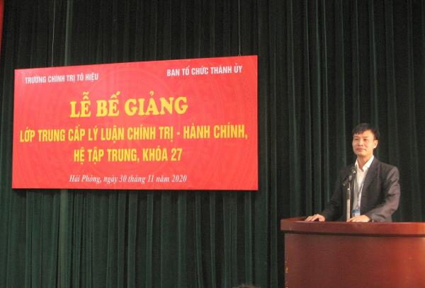 Chiều ngày 30/11/2020, Trường Chính trị Tô Hiệu phối hợp với Ban tổ chức Thành ủy tổ chức Lễ bế giảng lớp Trung cấp lý luận chính trị - hành chính, hệ tập trung, khóa 27. Tới dự có các đồng chí Nguyễn Văn Hiểu - Bí thư Đảng ủy, Hiệu trưởng Trường; đồng chí Nguyễn Thị Hải Hà - Phó Bí thư Đảng ủy, Phó Hiệu trưởng Trường; đại diện lãnh đạo các khoa, phòng Nhà trường, chủ nhiệm lớp và học viên của lớp.