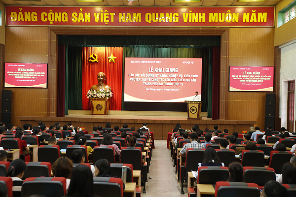 Sáng 23/9, Trường Chính trị Tô Hiệu phối hợp với Sở Nội vụ thành phố tổ chức Lễ khai giảng các Lớp bồi dưỡng kỹ năng, nghiệp vụ, kiến thức chuyên sâu về công tác tôn giáo trên địa bàn thành phố (đợt 2) năm 2024. Tới dự có các đồng chí: PGS.TS Nguyễn Lan Hiền, nguyên Viện trưởng Viện Tôn giáo và Tín ngưỡng, Học viện Chính trị quốc gia Hồ Chí Minh; TS Nguyễn Kim Pha, Hiệu trưởng Trường Chính trị Tô Hiệu; lãnh đạo Ủy ban MTTQ Việt Nam thành phố, Ban Dân vận Thành ủy; đại diện một số sở, ban, ngành; các Phó Hiệu trưởng Trường Chính trị Tô Hiệu cùng cán bộ, giảng viên, viên chức nhà trường và học viên 04 lớp bồi dưỡng.
