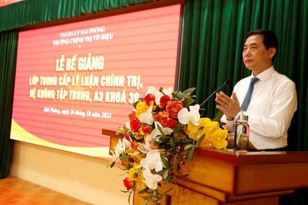 Phát biểu bế giảng lớp học, TS. Nguyễn Kim Pha, Bí thư Đảng ủy, Hiệu trưởng Trường chúc mừng học viên của lớp đã hoàn thành khóa học. Thay mặt cho Đảng ủy, Lãnh đạo Trường, đồng chí đã biểu dương, ghi nhận tinh thần học tập và rèn luyện của lớp; đồng thời mong muốn mỗi học viên sẽ phát huy những kiến thức đã được học tập, nghiên cứu, vận dụng sáng tạo lý luận vào thực tiễn công tác; gương mẫu, đi đầu thực hiện tốt các nhiệm vụ được giao, đóng góp tích cực hơn nữa vào sự phát triển chung của Thành phố trong giai đoạn hiện nay.