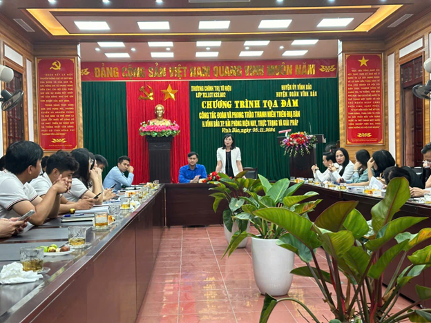 Tại buổi nghiên cứu thực tế, đoàn được nghe đồng chí Vũ Duy Minh, Bí thư Huyện Đoàn, Chủ tịch Hội Liên hiệp Thanh niên Việt Nam Huyện báo cáo về “Công tác Đoàn và Phong trào thanh niên trên địa bàn huyện Vĩnh Bảo hiện nay - Thực trạng và giải pháp”. Với sự định hướng, chỉ đạo của Huyện ủy, HĐND, UBND huyện; sự phối hợp của các tổ chức đoàn thể; năm 2024, công tác Đoàn và phong trào thanh niên toàn huyện được tập trung triển khai đồng đều trên các mặt công tác, đặc biệt coi trọng công tác giáo dục, công tác tổ chức xây dựng Đoàn, tham gia xây dựng Đảng; tăng cường ứng dụng công nghệ thông tin, chuyển đổi số, tạo sự chuyển biến tích cực cả về nội dung, phương thức hoạt động công tác Đoàn và phong trào thanh thiếu nhi, cụ thể hóa hiệu quả chủ đề công tác năm của Huyện và chủ đề công tác năm của Thành Đoàn, góp phần vào sự phát triển chung của huyện, thành phố.