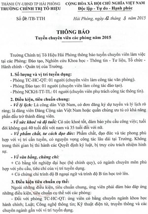 Ngày 12/3/2015, Trường Chính trị Tô Hiệu đã ban hành Thông báo số 04/TB-TTH về việc tuyển chuyên viên các phòng năm 2015