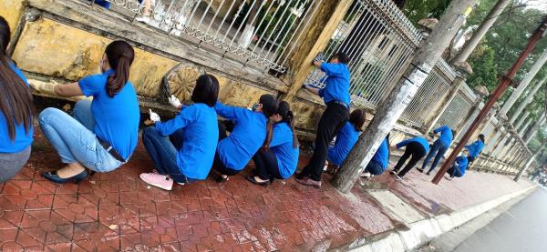 Đoàn Thanh niên đang lao động chỉnh trang, làm đẹp toàn bộ khuôn viên tường rào xung quanh Nhà trường.