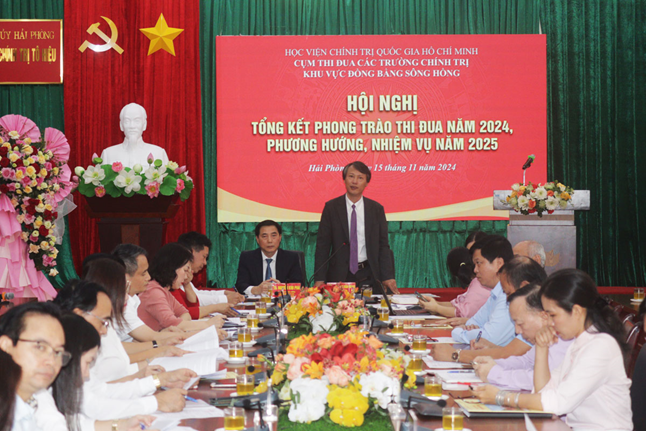 Phát biểu chỉ đạo tại Hội nghị, PGS.TS Hoàng Văn Hoan, Phó Vụ trưởng Vụ các trường chính trị, Học viện Chính trị quốc gia Hồ Chí Minh khẳng định những kết quả hoạt động của các phong trào thi đua và công tác khen thưởng của Cụm thi đua các trường chính trị đồng bằng Sông Hồng đã góp phần tích cực vào việc hoàn thành thắng lợi mục tiêu, nhiệm vụ chính trị của các trường trong năm 2024. PGS.TS Hoàng Văn Hoan cũng đề nghị trong thời gian tới, Cụm thi đua cần tiếp tục phát huy những ưu điểm đã đạt được, khắc phục những hạn chế, khó khăn; tiếp tục tăng cường giao lưu, học hỏi trao đổi kinh nghiệm giữa các thành viên trong Cụm thi đua và mở rộng giao lưu học hỏi kinh nghiệm với các Cụm thi đua trong cả nước; tổ chức triển khai có hiệu quả các nội dung giao ước thi đua của Cụm thi đua.
