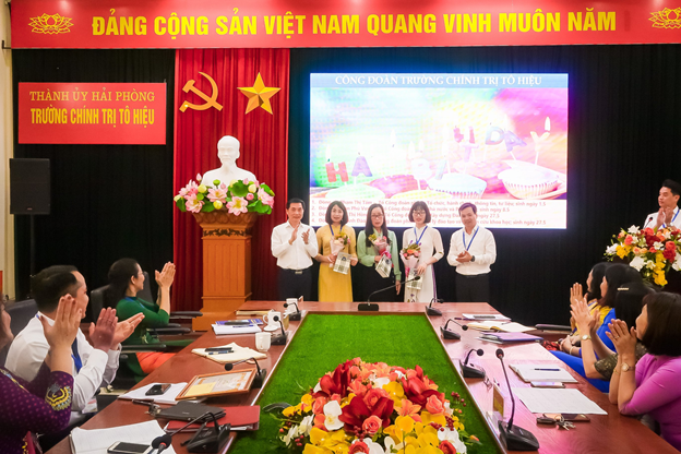 Đồng chí Bí thư Đảng ủy, Hiệu trưởng Trường; đồng chí Chủ tịch Công đoàn Trường tặng hoa chúc mừng đoàn viên công đoàn có sinh nhật trong tháng