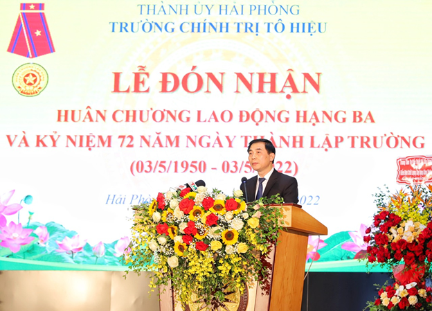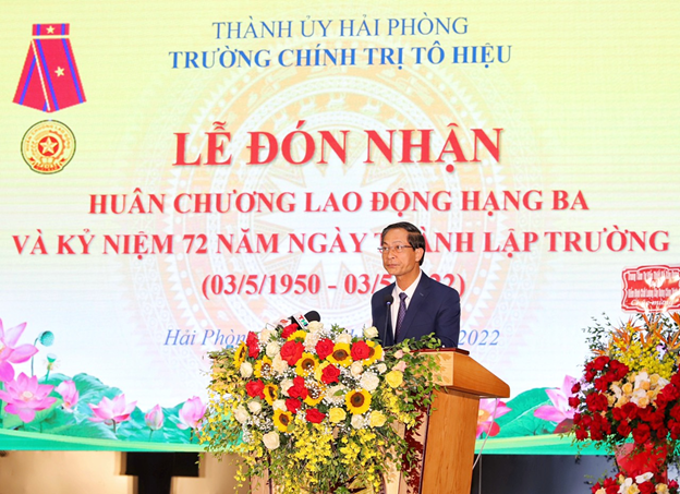 Sáng ngày 29/4, Trường Chính trị Tô Hiệu tổ chức Lễ đón nhận Huân chương Lao động hạng Ba và kỷ niệm 72 năm ngày thành lập Trường (03/5/1950 - 03/5/2022). Đến dự buổi Lễ có các đồng chí: Đỗ Mạnh Hiến, Phó Bí thư Thường trực Thành ủy; đồng chí Đào Khánh Hà, UVBTV, Trưởng Ban Tuyên giáo Thành ủy; đồng chí Đào Trọng Đức, UVBTV, Trưởng Ban Tổ chức Thành ủy; đồng chí Lê Khắc Nam, Phó Chủ tịch UBND thành phố; TS Nguyễn Thị Thanh Nhàn, Vụ trưởng Vụ các trường chính trị, Học viện Chính trị quốc gia Hồ Chí Minh; các đồng chí ủy viên Thành ủy; lãnh đạo các ban, sở, ngành; Thường trực các quận, huyện ủy; Lãnh đạo các trung tâm chính trị quận, huyện; Lãnh đạo các trường đại học trên địa bàn thành phố; các đơn vị, doanh nghiệp; các đồng chí cán bộ hưu trí cùng tập thể Lãnh đạo Trường, cán bộ, viên chức, học viên Nhà trường.