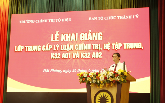 Thực hiện kế hoạch đào tạo, bồi dưỡng năm 2023, sáng ngày 26/6, Trường Chính trị Tô Hiệu tổ chức Lễ khai giảng 02 lớp Trung cấp Lý luận chính trị, hệ tập trung, K32 A01 và K32 A02. Dự lễ khai giảng có các đồng chí: Phạm Xuân Thanh, TUV, Bí thư Đảng uỷ Khối các cơ quan thành phố; TS. Nguyễn Kim Pha, Bí thư Đảng uỷ, Hiệu trưởng Trường; TS. Nguyễn Thị Hải Hà, Phó Bí thư Đảng uỷ, Phó Hiệu trưởng Trường; đại diện lãnh đạo phòng Chính sách tổng hợp, Ban Tổ chức Thành uỷ; đại diện lãnh đạo các ban Xây dựng Đảng, Đảng uỷ Khối các cơ quan thành phố; đại diện Ban Tổ chức các quận ủy, huyện ủy; Trưởng, phó các khoa, phòng, cán bộ, viên chức nhà Trường cùng toàn thể học viên 2 lớp.