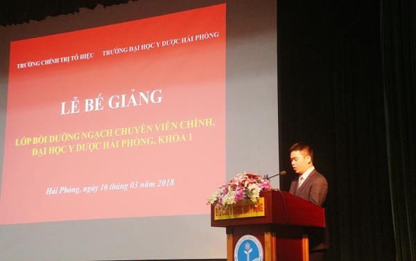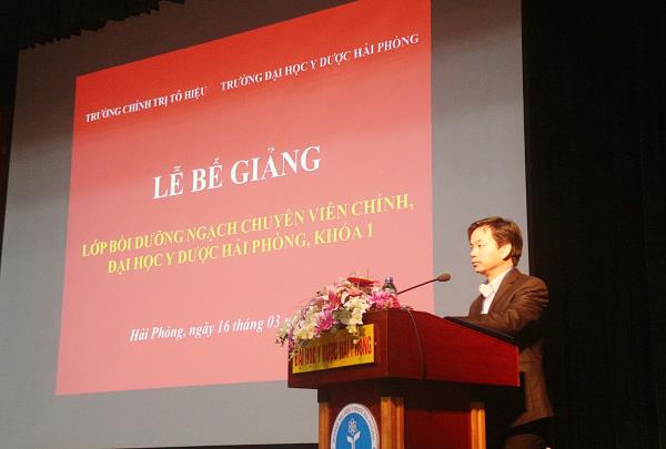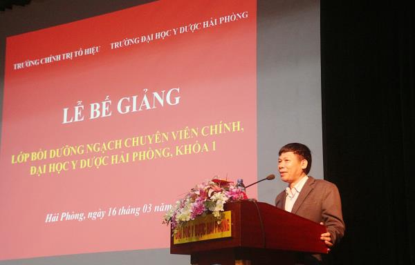 Đại diện lãnh đạo Trường Đại học Y Dược Hải Phòng, đồng chí Nguyễn Văn Hùng - Phó Hiệu trưởng, Trường Đại học Y Dược Hải Phòng đã phát biểu giao nhiệm vụ cho học viên. Đồng chí chân thành cảm ơn lãnh đạo Trường Chính trị Tô Hiệu đã tạo điều kiện, tổ chức lớp học có tính chất linh hoạt, giúp Trường Đại học Y Dược Hải Phòng bồi dưỡng, chuẩn hóa tiêu chuẩn ngạch bậc cán bộ, viên chức theo quy định của Nhà nước. Đồng chí chúc mừng các đồng chí học viên đã hoành thành tốt khóa học; mong muốn tập thể lớp tiếp tục phát huy tinh thần đoàn kết, phấn đấu nâng cao chất lượng công tác, trở thành những cán bộ, viên chức nòng cốt trong xây dựng và thực hiện sứ mệnh hoạt động của Trường. Mỗi đồng chí học viên cần phát huy vai trò cá nhân, vượt qua các thách thức của hiện tại, hướng tới các mục tiêu chung, khẳng định chất lượng, uy tín và vị thế của nhà trường.