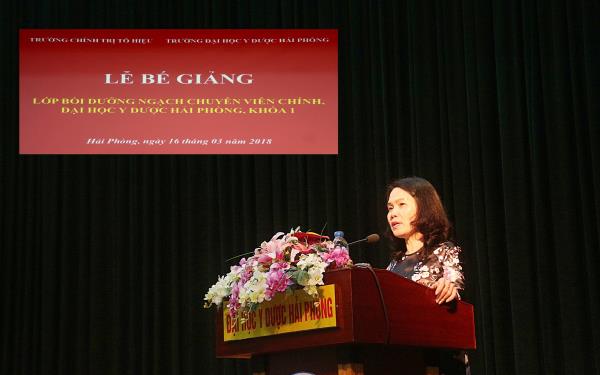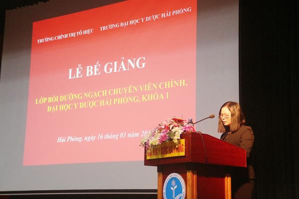 Phát biểu Bế giảng lớp học, đồng chí Trần Thị Bích Hằng - Bí thư Đảng ủy, Hiệu trưởng Trường Chính trị Tô Hiệu đã chúc mừng và biểu dương kết quả học tập của lớp. Những kết quả đạt được của lớp học một lần nữa khẳng định sự quan tâm, chăm lo của lãnh đạo hai nhà trường đối với công tác đào tạo, bồi dưỡng đội ngũ cán bộ, viên chức nói chung và sự cố gắng, nỗ lực của mỗi đồng chí học viên nói riêng khi tham gia khóa học. Đồng chí mong muốn sau khi kết thúc khóa học, các đồng chí học viên tiếp tục nghiên cứu, vận dụng tốt kiến thức, kỹ năng được trang bị vào thực tiễn công tác; hoàn tất yêu cầu nâng ngạch, đáp ứng tiêu chuẩn chức danh nghề nghiệp cao hơn, góp phần xây dựng và phát triển nhà trường và ngành y dược thành phố Hải Phòng trong tình hình hiện nay. Đồng chí chân thành cảm ơn các đồng chí lãnh đạo Trường Đại học Y Dược Hải Phòng đã quan tâm sâu sắc và tạo mọi điều kiện tốt nhất thực hiện thành công khóa học. Hy vọng, hai nhà trường thường xuyên trao đổi thông tin và chia sẻ kinh nghiệm trong công tác, hợp tác bồi dưỡng đội ngũ cán bộ, giảng viên đáp ứng yêu cầu phát triển hai nhà trường trong thời gian tới.