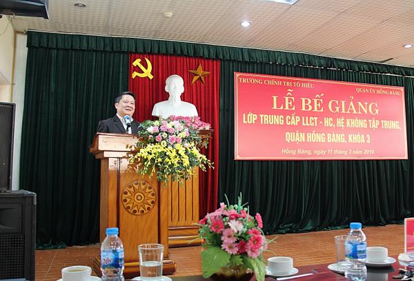 Thay mặt Thường trực Quận ủy Hổng Bàng và Ban Chỉ đạo lớp học, đồng chí Trần Quang Tuấn - Phó Bí thư Thường trực Quận ủy, Trưởng Ban Chỉ đạo lớp học đã phát biểu chúc mừng, ghi nhận kết quả học tập và giao nhiệm vụ cho học viên của lớp. Đồng chí nhấn mạnh mục tiêu phát triển kinh tế, xã hội của địa phương và công tác đào tạo, bồi dưỡng xây dựng đội ngũ cán bộ quận đáp ứng yêu cầu nhiệm vụ, cũng như sự quan tâm của Quận ủy Hồng Bàng về công tác này trong những năm qua và thời gian tới.