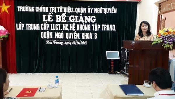 Sáng ngày 10/11/2018, tại Hội trường Trung tâm Bồi dưỡng Chính trị quận Ngô Quyền, Trường Chính trị Tô Hiệu đã phối hợp với Quận uỷ Ngô Quyền tổ chức Lễ bế giảng lớp Trung cấp lý luận chính trị - hành chính, hệ không tập trung, quận Ngô Quyền, khóa 8. Dự Lễ bế giảng có các đồng chí: Trần Thị Bích Hằng - Bí thư Đảng ủy, Hiệu trưởng Trường Chính trị Tô Hiệu; Đào Khánh Hà - Bí thư Quận ủy Ngô Quyền; đại diện lãnh đạo Ban Tổ chức Thành ủy, Trung tâm Bồi dưỡng chính trị quận Ngô Quyền; thành viên Ban Chỉ đạo lớp học; đại diện các khoa, phòng Trường Chính trị Tô Hiệu; lãnh đạo Trung tâm Bồi dưỡng Chính trị quận Ngô Quyền cùng học viên của lớp.