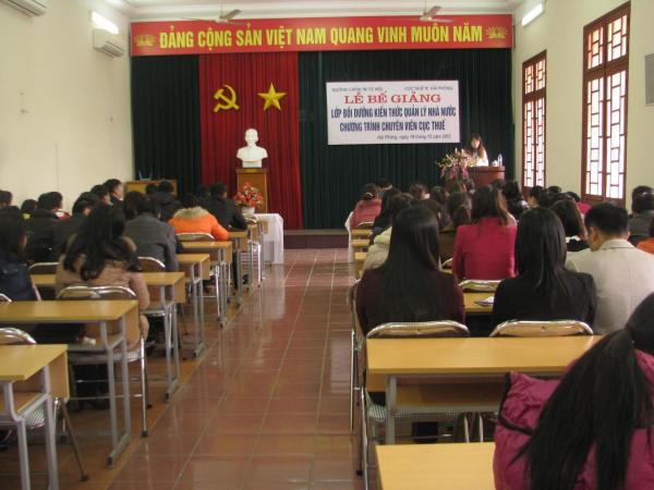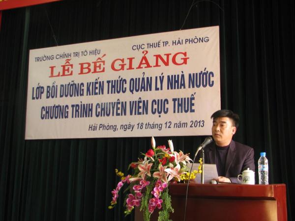 Sáng ngày 18/12, Trường Chính trị Tô Hiệu đã tổ chức lễ bế giảng lớp Bồi dưỡng kiến thức QLNN chương trình chuyên viên Cục Thuế Hải Phòng. Tới dự có các đồng chí: Trần Thị Bích Hằng – Hiệu trưởng Trường, Đoàn Hồng Điệp – Phó Cục trưởng Cục Thuế Hải Phòng cùng toàn thể 93 học viên của lớp học.