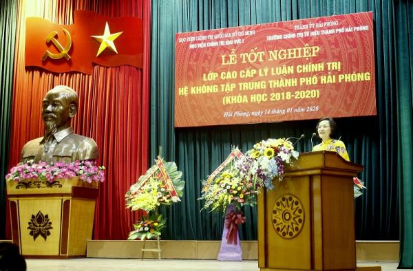 Phát biểu Bế giảng lớp học, PGS.TS Lê Thị Thục chúc mừng các học viên đã hoàn thành khóa học, đảm bảo đúng chương trình và mục tiêu đề ra. Đồng chí ghi nhận, đánh giá cao tinh thần và kết quả học tập, rèn luyện của mỗi đồng chí học viên. Đồng chí tin tưởng rằng, với những tri thức cơ bản, có hệ thống về Chủ nghĩa Mác - Lê nin, tư tưởng Hồ Chí Minh, quan điểm của Đảng, pháp luật của Nhà nước, khoa học lãnh đạo quản lý sẽ trang bị cho học viên thế giới quan khoa học, nhân sinh quan cách mạng, phương pháp làm việc biện chứng, phương pháp tư duy khoa học; giúp người học nâng cao phẩm chất, năng lực, tạo cơ sở cho việc tiếp thu, tự học, tự nghiên cứu trong quá trình công tác tại đơn vị. Mong muốn các học viên của lớp sẽ không ngừng học tập, rèn luyện, nâng cao ý thức, trách nhiệm với tổ chức, với Đảng, tiếp tục gặt hái được nhiều thành công hơn nữa, góp phần cùng cơ quan, đơn vị thực hiện tốt nhiệm vụ trong bối cảnh hiện nay. Thay mặt lãnh đạo Học viện, đồng chí gửi lời cảm ơn sâu sắc tới lãnh đạoThành ủy Hải Phòng, Trường Chính trị Tô Hiệu và các đơn vị liên quan đã quan tâm phối hợp với Học viện Chính trị Khu vực I tổ chức thành công khóa học.