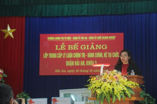Phát biểu tại buổi Lễ, đồng chí Nguyễn Ngọc Tuất – Phó Bí thư Thường trực Quận ủy Hải An, Trưởng Ban chỉ đạo lớp học đã chúc mừng kết quả học tập của tập thể lớp. Đồng chí nhấn mạnh, thực hiện chủ trương, đường lối của Đảng, chỉ đạo của Thành phố về công tác cán bộ, các cấp lãnh đạo Quận luôn quan tâm công tác xây dựng và phát triển đội ngũ cán bộ địa phương, đáp ứng tốt yêu cầu nhiệm vụ trong giai đoạn hiện nay. Đào tạo, học tập nâng cao nhận thức lý luận chính trị và năng lực thực tiễn là nhiệm vụ quan trọng, thường xuyên, mang tính bắt buộc của cán bộ, công chức Quận. Đồng chí chân thành cảm ơn Ban Tổ chức Thành ủy, Trường Chính trị Tô Hiệu, Đảng ủy Khối Doanh nghiệp thành phố đã quan tâm, giúp đỡ Quận Hải An trong công tác đào tạo, bồi dưỡng đội ngũ cán bộ trong thời gian qua; cảm ơn Quận ủy, Ủy ban nhân dân quận, Ban Tổ chức Quận ủy, Trung tâm Bồi dưỡng chính trị quận đã tạo mọi điều kiện tốt nhất trong tổ chức thực hiện lớp học, giúp học viên hoàn thành tốt khóa học. Đồng chí mong muốn các đồng chí học viên tiếp tục phát huy, vận dụng tốt kiến thức được trang bị vào giải quyết công việc để hoàn thành tốt nhiệm vụ được giao.