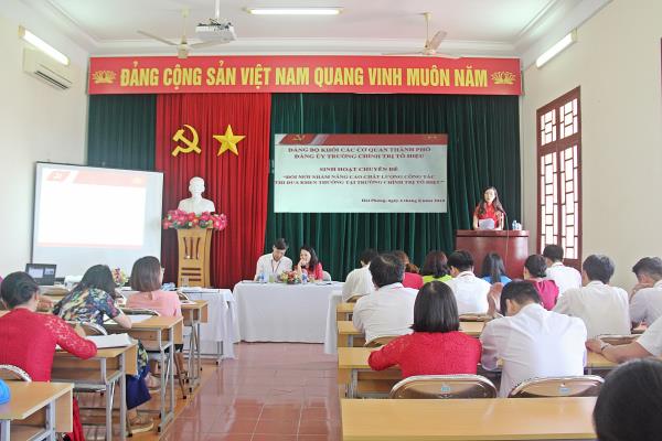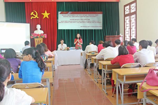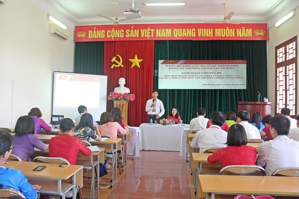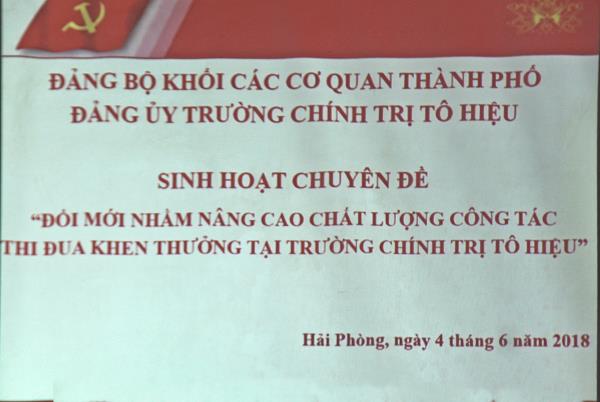 “Đổi mới nhằm nâng cao chất lượng công tác thi đua khen thưởng tại Trường Chính trị Tô Hiệu”. Tham dự buổi sinh hoạt chuyên đề có các đồng chí: Trần Thị Bích Hằng - Bí thư Đảng ủy, Hiệu trưởng, Nguyễn Văn Kính - Phó Bí thư Đảng ủy, Phó Hiệu trưởng; các đồng chí Đảng ủy viên, Phó Hiệu trưởng cùng toàn thể đảng viên trong Đảng bộ Trường. Các đồng chí: Trần Thị Bích Hằng - Bí thư Đảng ủy, Hiệu trưởng, Nguyễn Văn Hiểu - Phó Hiệu trưởng Trường chủ trì và điều hành buổi sinh hoạt chuyên đề.