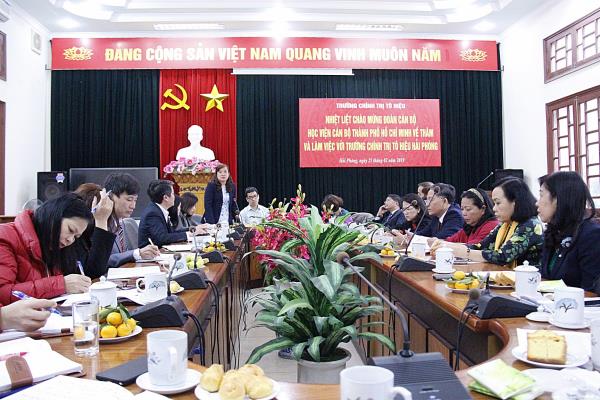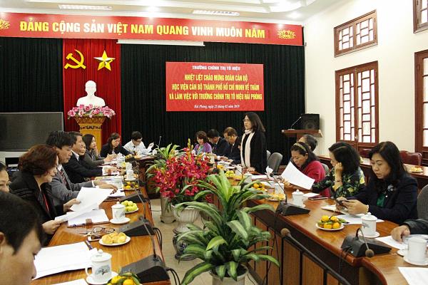 Thay mặt Đoàn công tác của Học viện Cán bộ Thành phố Hồ Chí Minh, TS. Bùi Thị Ngọc Trang - UV Ban thường vụ Đảng ủy, Phó Giám đốc Học viện, phụ trách đoàn đã chân thành cảm ơn sự quan tâm đón tiếp chu đáo, nồng hậu của Đảng ủy, Ban Giám hiệu và tập thể Trường Chính trị Tô Hiệu Hải Phòng dành cho Đoàn. Đồng chí chúc mừng những thành tựu to lớn của Trường Chính trị Tô Hiệu trong những năm qua; ghi nhận và đánh giá cao kết quả buổi làm việc. Hy vọng, những thông tin được chia sẻ, sẽ trở thành những kinh nghiệm quý trong hoạt động của mỗi nhà trường; mong muốn tăng cường trao đổi thông tin và hợp tác giữa hai nhà trường trong thời gian tới./.