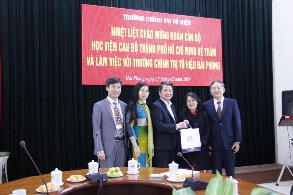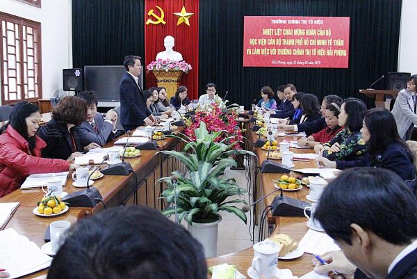Tại buổi làm việc, đồng chí Nguyễn Văn Kính - Phó Bí thư Đảng ủy, Phó Hiệu trưởng Nhà trường đã nhiệt liệt chào mừng Đoàn công tác của Học viện Cán bộ Thành phố Hồ Chí Minh đã tới thăm thành phố Hải Phòng và Trường Chính trị Tô Hiệu. Đồng chí vui mừng thông tin sơ lược với Đoàn công tác một số vấn đề về quá trình hình thành và phát triển của thành phố Cảng Hải Phòng; những đóng góp của thành phố đối với quá trình đổi mới của đất nước; các thành tựu phát triển kinh tế - xã hội nổi bất của thành phố trong những gần đây đã có nhiều khởi sắc, trở thành điểm sáng trong phát triển đất nước. Chia sẻ đôi nét về lịch sử hình thành và phát triển của Trường Chính trị Tô Hiệu trên 60 năm qua; về chức năng, nhiệm vụ và tổ chức bộ máy của Nhà trường hiện nay vànhững định hướng phát triển cơ bản, gắn với việc thực hiện nhất quán Quy định số 09-QĐi/TW, ngày 13/11/2018 của Ban Bí thư, nâng cao chất lượng đào tạo, bồi dưỡng cán bộ của Nhà trường trong những năm tới.