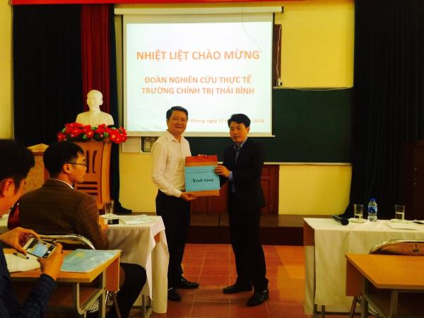 Trong khuôn khổ chuyến Nghiên cứu thực tế tại thành phố Hải Phòng, sáng ngày 17/4/2018, Đoàn công tác của cán bộ, giảng viên và học viên Trường Chính trị tỉnh Thái Bình đã đến thăm và công tác tại Trường Chính trị Tô Hiệu Hải Phòng. Đoàn công tác do đồng chí Đặng Xuân Phong - Phó Giám đốc trường làm Trưởng đoàn cùng các đồng chí giảng viên và học viên Lớp Trung cấp lý luận chính trị - hành chính K35A, hệ tại chức Trường Chính trị tỉnh Thái Bình.