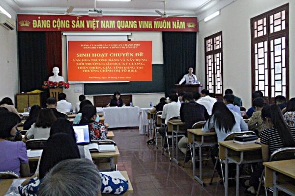 Thực hiện Kế hoạch công tác năm 2018, chiều ngày 28/9/2018, Đảng bộ Trường Chính trị Tô Hiệu đã tổ chức sinh hoạt chuyên đề với nội dung: “Văn hóa trường Đảng và xây dựng môi trường giáo dục kỷ cương, thân thiện, giàu tính Đảng tại Trường Chính trị Tô Hiệu”. Tới dự và chỉ đạo sinh hoạt chuyên đề có đồng chí Trần Thị Bích Hằng - Bí thư Đảng ủy, Hiệu trưởng Trường; các đồng chí là ủy viên Ban Chấp hành Đảng bộ; Bí thư, Phó Bí thư các chi bộ, các đồng chí đảng viên thuộc 7 chi bộ khoa, phòng và chi bộ lớp Trung cấp Lý luận chính trị - hành chính, hệ đào tạo tập trung, K26 thuộc đảng bộ Trường.