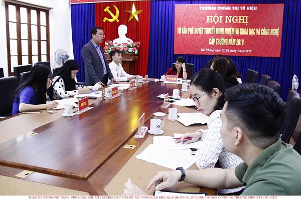 Thực hiện kế hoạch công tác nghiên cứu khoa học năm 2019, trong các ngày 05,06 /03, tại phòng họp nhà A, Trường Chính trị Tô Hiệu đã tổ chức các Hội nghị tư vấn phê duyệt thuyết minh nhiệm vụ khoa học và công nghệ cấp trường năm 2019. Tham dự Hội nghị có các đồng chí trong Hội đồng khoa học Trường; các nhà quản lý, nhà khoa học thuộc các lĩnh vực liên quan của các cơ quan, đơn vị trong và ngoài thành phố; Ban Chủ nhiệm các đề tài; đại biểu quan tâm. Đồng chí Trần Thị Bích Hằng - Hiệu trưởng, Chủ tịch HĐKH nhà trường chủ trì các Hội nghị.