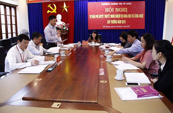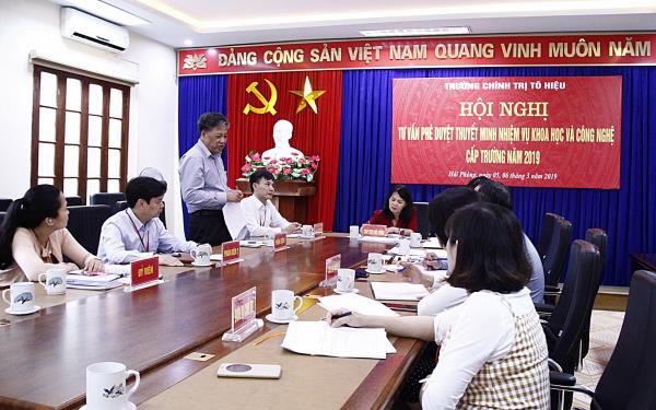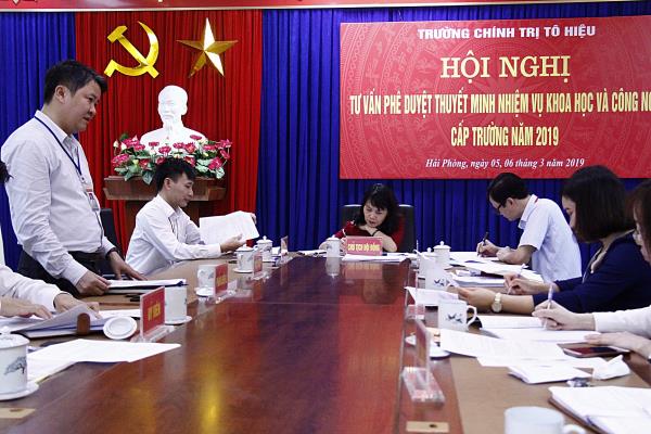 Hội nghị tư vấn phê duyệt thuyết minh nhiệm vụ khoa học và công nghệ cấp trường năm 2019 được thực hiện nghiêm túc theo Quy chế quản lý các nhiệm vụ khoa học và công nghệ có sử dụng ngân sách nhà nước thành phố Hải Phòng ban hành kèm theo Quyết định số 2848/2015/QĐ-UBND ngày 21/12/2015 của Ủy ban nhân dân thành phố Hải Phòng và Quy chế hoạt động NCKH của trường chính trị tỉnh, thành phố trực thuộc Trung ương ban hành kèm theo Quyết định số 1855/QĐ-HVCTQG ngày 21/4/2016 của Giám đốc Học viện Chính trị quốc gia Hồ Chí Minh. Trên cơ sở thuyết minh đề tài NCKH do Ban chủ nhiệm xây dựng, trình bày, các thành viên Hội đồng tư vấn đã xem xét, góp ý đối với các thuyết minh đề tài. Hội đồng đánh giá cao tính cấp thiết, thời sự và khả năng ứng dụng trong thực tiễn hoạt động của nhà trường trong thời gian tới của các đề tài nghiên cứu. Đồng thời phân tích, đánh giá, góp ý cụ thể đối với mỗi bản thuyết minh nhiệm vụ, yêu cầu chỉnh sửa, hoàn thiện thuyết minh đảm bảo tính khoa học và khả năng tổ chức nghiên cứu đạt kết quả tốt nhất, trên các phương diện, như: Tên gọi, mục tiêu đề tài; đối tượng và phạm vi nghiên cứu; các nội dung nghiên cứu, phương pháp nghiên cứu; ý nghĩa khoa học, giá trị thực tiễn; việc xây dựng các mẫu phiếu điều tra, khảo sát; kế hoạch thực hiện đề tài. Trên cơ sở đó làm rõ tính khả thi và khả năng tiến hành nghiên cứu của mỗi nhiệm vụ khoa học.
