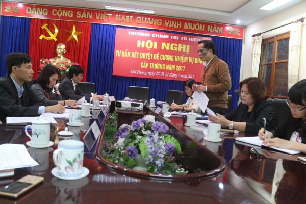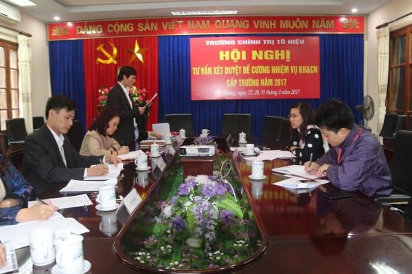 Triển khai kế hoạch hoạt động khoa học năm 2017, trong thời gian 03 ngày (27,28,31/3/2017), Trường Chính trị Tô Hiệu đã tổ chức các Hội nghị tư vấn xét duyệt đề cương đề tài nghiên cứu khoa học cấp trường. Thành viên Hội đồng có các đồng chí cán bộ lãnh đạo, quản lý, giảng viên của nhà trường ; Lãnh đạo một số Ban, Ngành, quận, huyện và cán bộ, giảng viên một số trường đại học, cao đẳng trên địa bàn thành phố. Đồng chí Trần Thị Bích Hằng - Hiệu trưởng Trường, Chủ tịch Hội đồng khoa học Trường chủ trì các Hội nghị.
