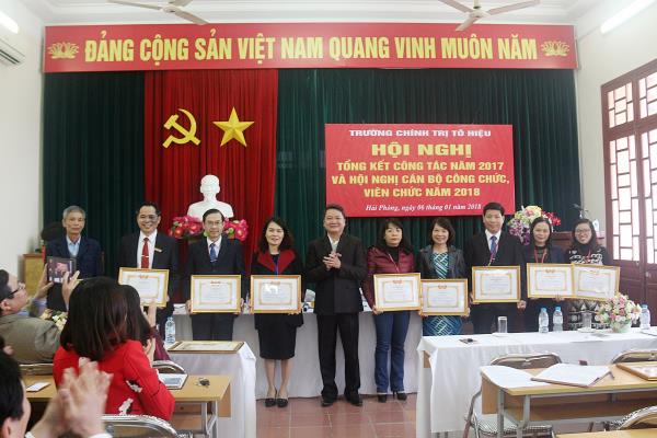 Kết quả thi đua, khen thưởng năm 2017: danh hiệu tập thể có 7/7 đơn vị đạt danh hiệu Tập thể lao động tiên tiến, trong đó có 02 đơn vị đạt danh hiệu Tập thể lao động xuất sắc (khoa Xây dựng Đảng và phòng Tổ chức – Hành chính – Quản trị); 58/61 đồng chí đạt danh hiệu Lao động tiên tiến, 03/61 đồng chí không dự bình xét; 10 đồng chí đạt danh hiệu Chiến sĩ thi đua cấp cơ sở; 09 đồng chí được Hiệu trưởng khen. Về khen thưởng của Công đoàn: 01 đồng chí được Liên đoàn Lao động thành phố tặng Bằng khen; 03 đồng chí được Công đoàn viên chức Thành phố tặng Giấy khen; 7/7 Tổ công đoàn hoàn thành tốt nhiệm vụ, trong đó 02 Tổ công đoàn hoàn thành xuất sắc nhiệm vụ (khoa Xây dựng Đảng và phòng Tổ chức – Hành chính – Quản trị); 58 đoàn viên công đoàn hoàn thành tốt nhiệm vụ, trong đó 10 đoàn viên công đoàn hoàn thành xuất sắc nhiệm vụ. Tổng kết năm học 2016-2017 của Cụm thi đua Số 1, Trường Chính trị Tô Hiệu vinh dự được Giám đốc Học viện Chính trị Quốc gia Hồ Chí Minh tặng Bằng khen vì những thành tích Trường đạt được trong năm học.