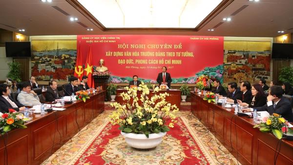 Sáng ngày 14/01/2017, tại Trung tâm Hội nghị Thành phố Hải Phòng đã diễn ra Hội nghị chuyên đề “Xây dựng văn hóa trường Đảng theo tư tưởng, đạo đức, phong cách Hồ Chí Minh”. Hội nghị do Đảng ủy Học viện Chính trị quốc gia Hồ Chí Minh và Thành ủy Hải Phòng phối hợp tổ chức. Các đồng chí Ủy viên Trung ương Đảng: GS, TS Nguyễn Xuân Thắng, Bí thư Đảng ủy -Giám đốc Học viện Chính trị quốc gia Hồ Chí Minh; Lê Văn Thành, Bí thư Thành ủy – Chủ tịch HĐND TP Hải Phòng chủ trì hội nghị.
