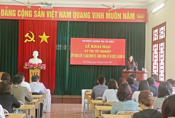07h30’, ngày 18/4/2018, tại Phòng học số 3, Trường Chính trị Tô Hiệu đã tổ chức Lễ khai mạc kỳ thi tốt nghiệp lớp Trung cấp lý luận chính trị - hành chính, hệ tại chức, A3 khóa 34. Dự lễ khai mạc có đồng chí Nguyễn Thị Hải Hà - Phó Hiệu trưởng, Phó Chủ tịch Hội đồng thi, Trưởng Ban coi thi; các đồng chí trong Hội đồng thi; Ban coi thi; Ban thanh tra và các học viên dự thi tốt nghiệp.