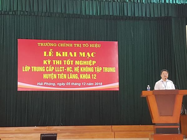 về việc tổ chức kỳ thi và thành lập Hội đồng thi tốt nghiệp Lớp Trung cấp LL CT-HC, hệ không tập trung, huyện Tiên Lãng, khóa 12, sáng 05/12/2018, tại Trung tâm Bồi dưỡng chính trị huyện Tiên Lãng, Trường Chính trị Tô Hiệu tổ chức Lễ khai mạc kỳ thi tốt nghiệp cho Lớp Trung cấp LL CT-HC, hệ không tập trung, huyện Tiên Lãng, khóa 12. Dự lễ khai mạc có các đồng chí: Nguyễn Văn Kính - Phó Hiệu trưởng, Phó Chủ tịch Hội đồng thi; Vũ Thế Tuyền - UVBTVHU, Trưởng Ban Dân vận, Chủ tịch Mặt trận Tổ quốc Việt Nam huyện Tiên Lãng; Lương Văn Minh - UVBTVHU, Trưởng Ban Tổ chức Huyện ủy; Vũ Hoàng Phương - Huyện ủy viên, Chánh văn phòng Huyện ủy Tiên Lãng; Ngô Ngọc Khánh - UVBTVHU, Trưởng Ban Tuyên giáo, Giám đốc Trung tâm BDCT huyện Tiên Lãng; các đồng chí trong Hội đồng thi; Ban coi thi; Thanh tra kỳ thi và các học viên dự thi tốt nghiệp.