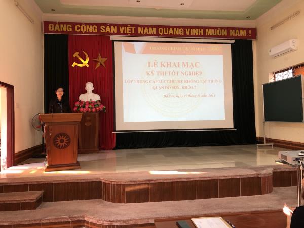 Thực hiện Quyết định số 222/QĐ-TTH ngày 23/11/2018 của Hiệu trưởng Trường Chính trị Tô Hiệu về việc tổ chức kỳ thi và thành lập Hội đồng thi tốt nghiệp Lớp Trung cấp LLCT-HC, hệ không tập trung, quận Đồ Sơn, khóa 7, sáng 27/11/2018, tại Trung tâm Bồi dưỡng chính trị quận Đồ Sơn, Trường Chính trị Tô Hiệu tổ chức Lễ khai mạc kỳ thi tốt nghiệp cho Lớp Trung cấp LLCT-HC, hệ không tập trung, quận Đồ Sơn, khóa 7. Dự lễ khai mạc có các đồng chí: Nguyễn Thị Hải Hà - Phó Hiệu trưởng, Phó Chủ tịch Hội đồng thi, Trưởng Ban coi thi; Bùi Thị Hồng Vân - Phó Bí thư Thường trực Quận ủy Đồ Sơn, Trưởng Ban Chỉ đạo lớp học; lãnh đạo Trung tâm BDCT quận Đồ Sơn; các đồng chí trong Hội đồng thi; Ban coi thi; Thanh tra kỳ thi và các học viên dự thi tốt nghiệp.