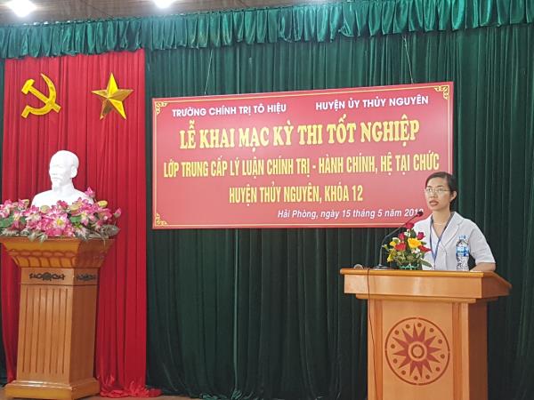 Sáng ngày 15/5/2018, tại Trung tâm Bồi dưỡng Chính trị huyện Thủy Nguyên, Trường Chính trị Tô Hiệu phối hợp với Huyện ủy Thủy Nguyên tổ chức Lễ khai mạc kỳ thi tốt nghiệp cho lớp Trung cấp Lý luận chính trị - hành chính, hệ tại chức, huyện Thủy Nguyên, khóa 12. Dự lễ khai mạc có các đồng chí: Nguyễn Thị Hải Hà - Phó Hiệu trưởng Trường Chính trị Tô Hiệu, Phó Chủ tịch Hội đồng thi, Trưởng Ban coi thi; Nguyễn Huy Hoàng - Phó Bí thư Huyện ủy, Chủ tịch Hội đồng nhân dân huyện Thủy Nguyên, Trưởng Ban Chỉ đạo lớp học; các đồng chí ủy viên Ban thường vụ Huyện ủy, Trưởng các Ban xây dựng Đảng; các đồng chí thành viên Hội đồng thi, Ban coi thi, Ban thanh tra và các học viên dự thi tốt nghiệp.