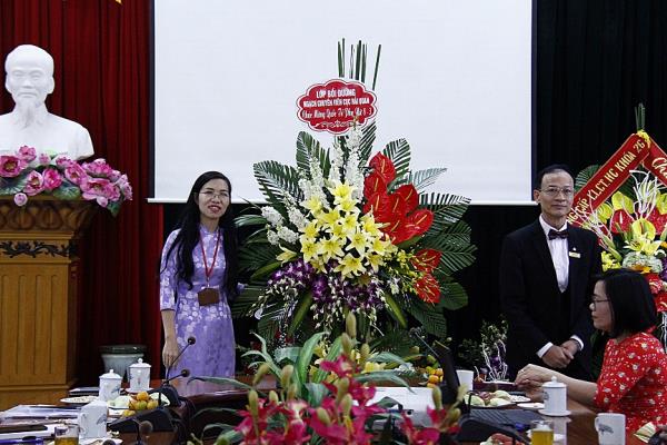 Đ/c Trần Thị Bích Hằng - Bí thư Đảng uỷ, Hiệu trưởng Trường nhận hoa chúc mừng 08/03 từ học viên