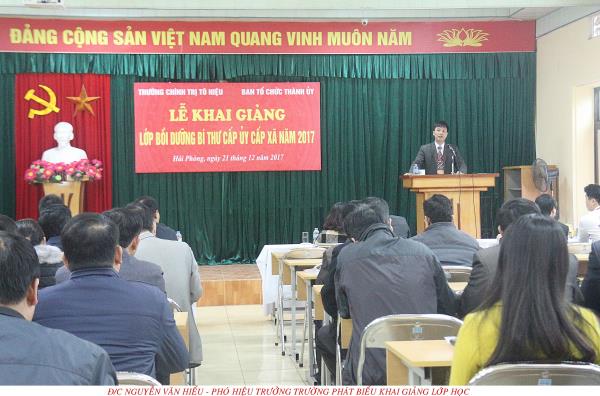 Sáng ngày 21/12/2017, Trường Chính trị Tô Hiệu phối hợp với Ban Tổ chức Thành ủy Hải Phòng tổ chức Lễ khai Khai giảng lớp Bồi dưỡng Bí thư cấp ủy cấp xã năm 2017. Tới dự có đồng chí Trần Thị Bích Hằng, Bí thư Đảng ủy, Hiệu trưởng Trường; đồng chí Nguyễn Văn Hiểu, Phó Hiệu trưởng Trường; các đồng chí đại diện phòng Chính sách cán bộ, Ban Tổ chức Thành ủy; trưởng, phó các khoa, phòng nhà trường cùng toàn thể 200 học viên là Bí thư các xã, phường, thị trấn trên địa bàn Thành phố.