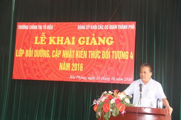 Sáng ngày 24/10/2016, Trường Chính trị Tô Hiệu phối hợp với Đảng ủy Khối Các cơ quan thành phố tổ chức Lễ khai giảng lớp Bồi dưỡng, cập nhật kiến thức đối tượng 4. Tới dự buổi Lễ, có các đ/c: Phạm Xuân Thanh - TUV, Bí thư Đảng ủy, Nguyễn Thành Tô - Phó Bí thư Đảng ủy Khối CCQ TP; Trần Thị Bích Hằng - Hiệu trưởng, Nguyễn Văn Kính - Phó Hiệu trưởng Trường Chính trị Tô Hiệu; Đại diện lãnh đạo các đơn vị: phòng Chính sách - Cán bộ, Ban Tổ chức Thành ủy; các khoa, phòng nhà trường cùng 100 học viên là cán bộ lãnh đạo, quản lý các cơ quan trực thuộc Đảng ủy Khối Các cơ quan Thành phố.