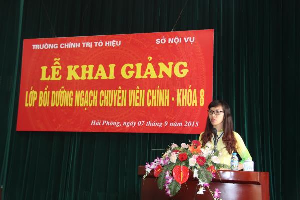 Thực hiện Kế hoạch đào tạo, bồi dưỡng đội ngũ cán bộ, công chức Thành phố năm 2015. Sáng ngày 07/9, Trường Chính trị Tô Hiệu phối hợp với Sở Nội vụ thành phố Hải Phòng tổ chức khai giảng lớp Bồi dưỡng ngạch chuyên viên chính khóa 8. Tham dự Lễ khai giảng có các đồng chí: Trần Thị Bích Hằng – Hiệu trưởng Trường, Nguyễn Văn Kính – Phó Hiệu trưởng Trường, đại diện lãnh đạo phòng Công chức, Viên chức Sở Nội vụ và các khoa, phòng nhà trường.