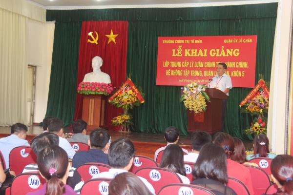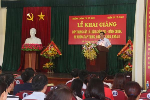 Thực hiện kế hoạch đào tạo năm 2017, sáng ngày 6/6, tại hội trường quận ủy Lê Chân, Trường Chính trị Tô Hiệu phối hợp với quận ủy Lê Chân tổ chức khai giảng lớp Trung cấp lý luận chính trị - hành chính, hệ không tập trung khóa 5. Tới dự Lễ Khai giảng có các đồng chí: Nguyễn Thị Hằng - Trưởng phòng Chính sách cán bộ Ban Tổ chức Thành ủy; Nguyễn Văn Kính - Phó bí thư Đảng ủy - Phó Hiệu trưởng Trường Chính trị Tô Hiệu; Nguyễn Văn Tuấn - Phó Bí thư Thường trực quận ủy, Chủ tịch HĐND quận Lê Chân; Bùi Thế Hưng - Ủy viên BTV, Trưởng ban Tổ chức quận ủy; đại diện Phòng Chính sách cán bộ Ban Tổ chức Thành ủy, đại diện lãnh đạo Đảng ủy Khối, lãnh đạo các Ban Đảng của quận ủy, thành viên Ban Chỉ đạo lớp học, lãnh đạo phòng Đào tạo Trường; lãnh đạo, cán bộ, viên chức Trung tâm Bồi dưỡng chính trị quận cùng các đồng chí học viên của lớp tham dự.