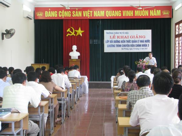Thực hiện kế hoạch đào tạo, bồi dưỡng cán bộ, công chức của thành phố năm 2012, tiếp theo lớp bồi dưỡng kiến thức quản lý nhà nước chuyên viên chính khóa 2, sáng ngày 15/8, Trường Chính trị Tô Hiệu phối hợp với Sở Nội vụ tổ chức khai giảng lớp bồi dưỡng kiến thức quản lý nhà nước chương trình chuyên viên chính khóa 3. Tới dự, có đồng chí Nguyễn Huy Hảo – Bí thư Đảng ủy, Hiệu trưởng nhà trường, đồng chí Nguyễn Thị Mai – Phó Giám đốc Sở Nội vụ cùng toàn thể 75 học viên của lớp bồi dưỡng.