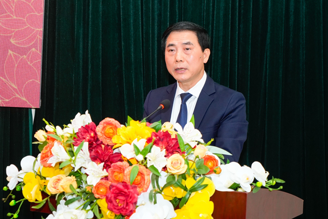 TS Nguyễn Kim Pha, Bí thư Đảng uỷ, Hiệu trưởng Trường báo cáo tại buổi khánh thành Phòng Truyền thống