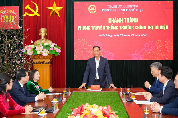 Phát biểu tại buổi khánh thành, Phó Bí thư Thường trực Thành ủy Đỗ Mạnh Hiến biểu dương, đánh giá cao sự năng động, sáng tạo và nỗ lực của cán bộ, giảng viên trường đã hoàn thành, khánh thành Phòng Truyền thống nhà trường vào đúng dịp thành phố tổ chức các chuỗi hoạt động kỷ niệm 94 năm Ngày thành lập Đảng, góp phần nhân thêm giá trị, ý nghĩa của công trình. Đồng chí mong rằng, cán bộ, viên chức, người lao động Trường Chính trị Tô Hiệu tiếp tục phát huy truyền thống 74 năm xây dựng, phát triển và thành tích xuất sắc trong thời gian qua, phấn đấu đạt chuẩn mức 2 vào năm 2025. Cùng với đó, nhà trường cần tiếp tục bổ sung các tư liệu, hiện vật để Phòng Truyền thống nhà trường không chỉ là địa chỉ đỏ của các thế hệ cán bộ, giảng viên, viên chức, người lao động của riêng Trường Chính trị Tô Hiệu mà còn của cả đội ngũ cán bộ, đảng viên toàn thành phố.