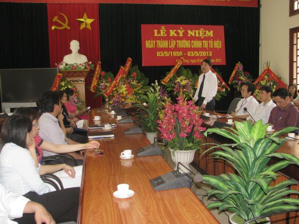 Sáng ngày 03/5, Trường Chính trị Tô Hiệu đã long trọng tổ chức kỷ niệm 63 năm ngày thành lập Trường (03/5/1950 - 03/5/2013). Tham dự lễ kỷ niệm có đồng chí Lê Khắc Nam – Thành ủy viên, Phó Chủ tịch UBND thành phố; đồng chí Nguyễn Kim Pha – Phó trưởng phòng văn xã UBND thành phố; đồng chí Nguyễn Huy Hảo – Bí thư Đảng ủy, Hiệu trưởng nhà trường; các đồng chí trong Ban Giám hiệu, lãnh đạo các đoàn thể, các đơn vị cùng toàn thể các đồng chí cán bộ, viên chức, lao động trường. Đại diện lãnh đạo Ủy ban nhân dân thành phố; đại diện học viên các lớp đã gửi những bó hoa tươi thắm chúc mừng nhà trường.