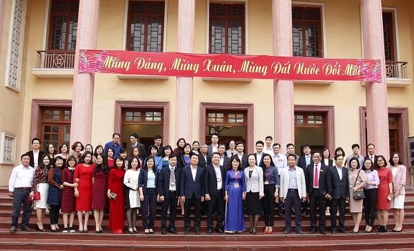 Đồng chí Nguyễn Thị Nghĩa - Phó Bí thư Thường trực Thành ủy, Trưởng đoàn ĐBQH thành phố Hải Phòng và đoàn công tác chụp ảnh lưu niệm nhân dịp Xuân mới cùng cán bộ, viên chức, người lao động Trường