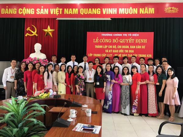 Thực hiện quyết định số 147/QĐ- TTH ngày13/9/2018 của Hiệu trưởng Trường Chính trị Tô Hiệu về việc mở lớp Trung cấp lý luận chính trị - hành chính, hệ đào tạo tập trung, khóa 26. Được sự nhất trí của Đảng ủy, Lãnh đạo trường, Ban Chấp hành Đoàn Thanh niên trường, sáng ngày 04/10/2018, tại phòng Hội thảo đã diễn ra Lễ công bố các quyết định thành lập Chi bộ, Chi đoàn, Ban cán sự và ký giao ước thi đua lớp Trung cấp lý luận chính trị - hành chính, hệ đào tạo tập trung, khóa 26.