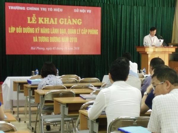 Thực hiện Kế hoạch đào tạo bồi dưỡng năm 2018, sáng ngày 05/10/2018, tại Hội trường số 4, Trường Chính trị Tô Hiệu đã phối hợp với Sở Nội vụ Hải Phòng tổ chức Lễ khai giảng lớp Bồi dưỡng kỹ năng lãnh đạo, quản lý cấp phòng và tương đương năm 2018. Tham dự Lễ khai giảng có đồng chí Nguyễn Văn Hiểu - Phó Hiệu trưởng Trường Chính trị Tô Hiệu; đại diện lãnh đạo các đơn vị khoa, phòng; lãnh đạo phòng Công chức, viên chức - Sở Nội vụ thành phố Hải Phòng và toàn thể học viên của lớp.
