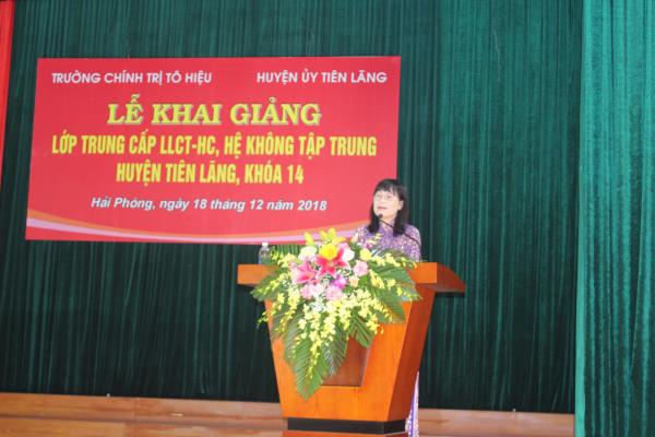 Đ/c Nguyễn Thị Mai Phương - Bí thư Huyện ủy, Chủ tịch HĐND Huyện Tiên Lãng Phát biểu giao nhiệm vụ cho học viên tại Lễ Khai giảng