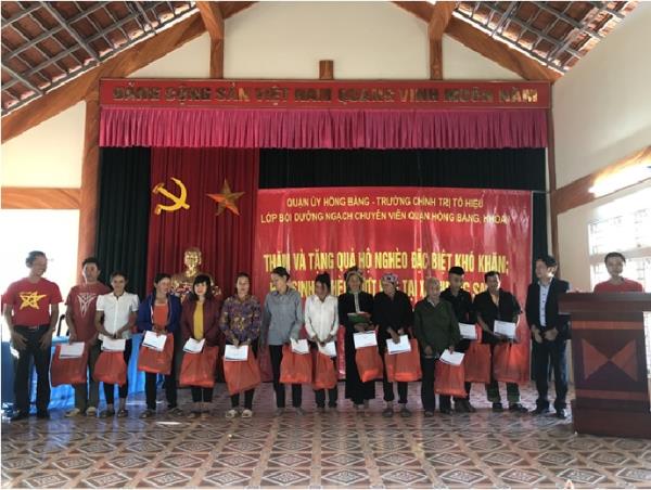 Bên cạnh chương tình tìm hiểu thực tế, tập thể lớp Bồi dưỡng ngạch chuyên viên, quận Hồng Bàng, khóa I đã thực hiện các chương trình thiện nguyện, nhằm chia sẻ với những khó khăn của các hộ nghèo và học sinh nơi đây. Đoàn đã thăm và tặng quà 20 hộ nghèo có hoàn cảnh đặc biệt khó khăn, các em học sinh tại điểm Trường Nà Bó. Đối với hộ nghèo mỗi suất quà bao gồm 500.000 đồng tiền mặt, 01 túi quà và 02 bộ áo mưa. Tặng cô và trò tại điểm Trường Nà Bó 500 quyển vở học sinh, 150 bộ dụng cụ học tập và 60 bộ áo mưa.