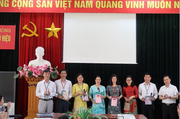 Đồng chí Nguyễn Văn Hiểu, Bí thư Đảng uỷ, Hiệu trưởng Trường và đồng chí Nguyễn Đình Hoàng, Chủ tịch Công đoàn Trường tặng hoa chúc mừng các đồng chí có sinh nhật trong tháng